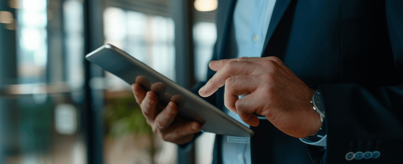 Focused businessman in suit using laptop, representing insights, strategies, and opportunities shared through the WIUS Capital blog